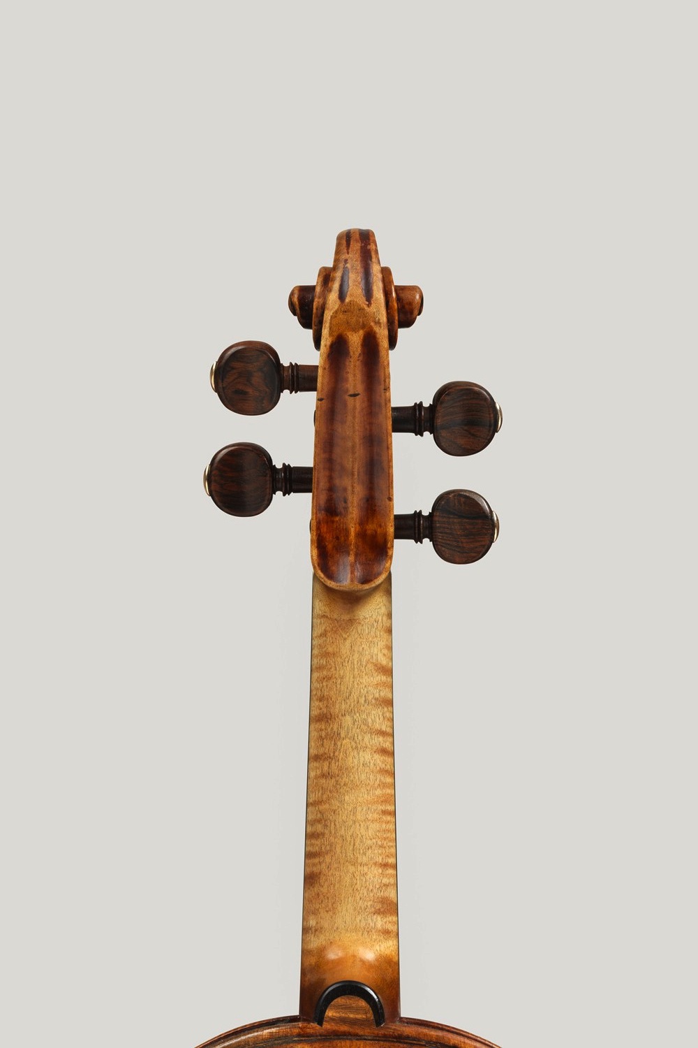 The violin in the Dextra Musica collection is a wonderful example of Alessandro’s work, and bears his original label dated 1714. The distinctive outline form is very graceful, with a slender waist formed by deeply incurved centre ribs, and a broad lower bout. Perhaps the most striking thing about it is the beautiful piece of maple used for the back; unjointed and with a deep and regular figure sloping across the bouts, it sums up many of the aspects which make classical Italian violinmaking such an absorbing and mysterious art. The interaction of the soft, heavily tinted varnish with the brilliantly reflective wood has a hypnotic effect, fully three-dimensional and shifting in colour and tone according to aspect and lighting. A mirror-matching piece may be seen in the 1710 “Rotondo”, another celebrated Alessandro Gagliano violin, often referred to as his masterpiece. The two are very similar, with the single difference that the spectacular figure of the backs slopes in opposite directions.