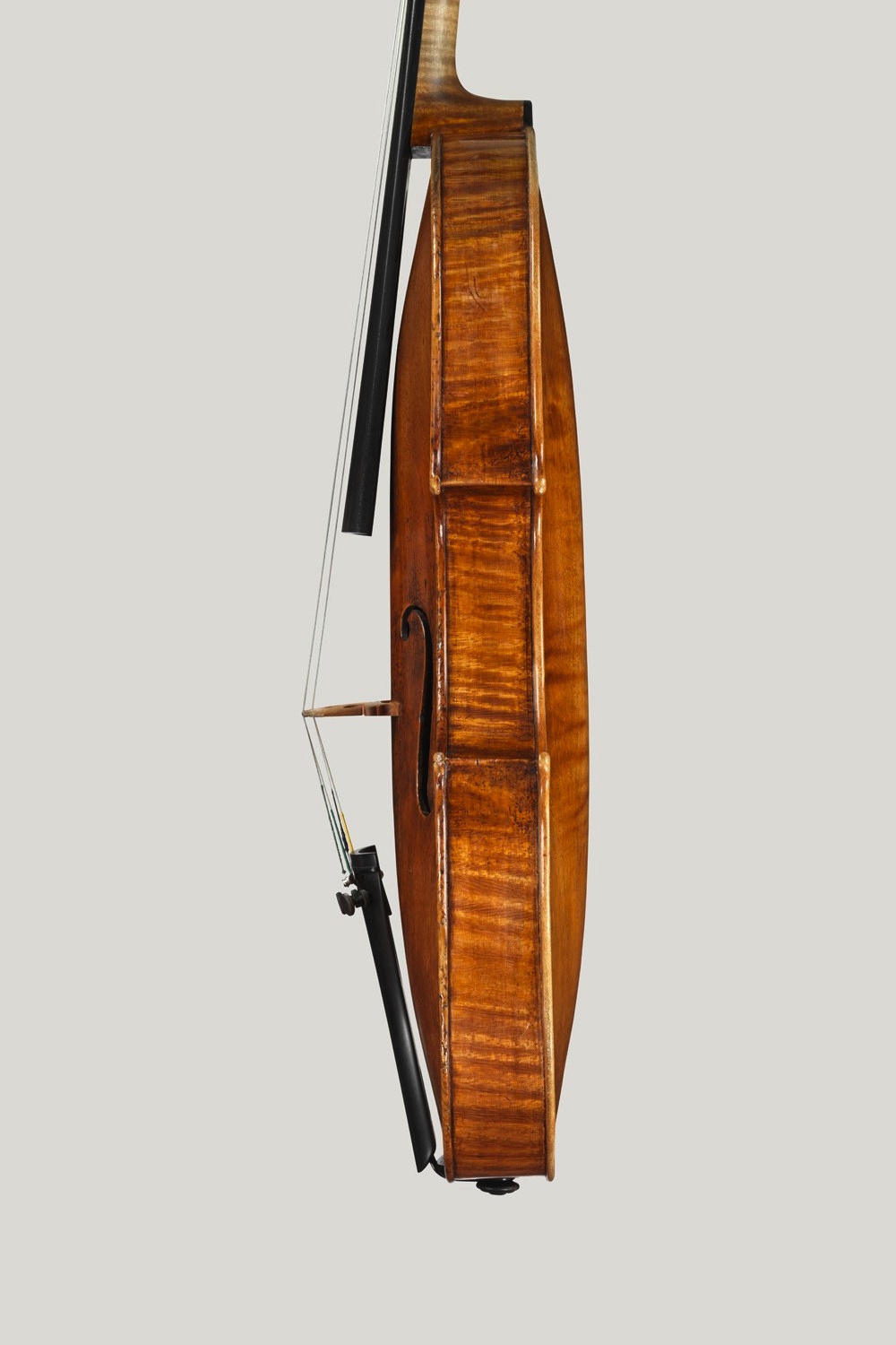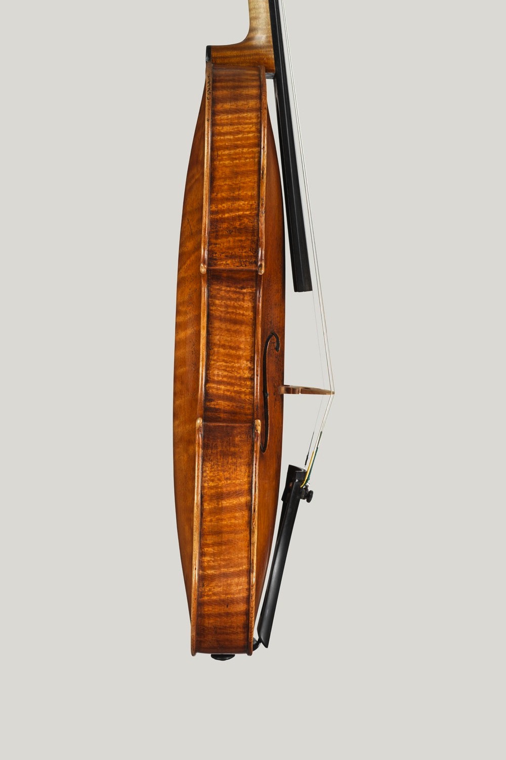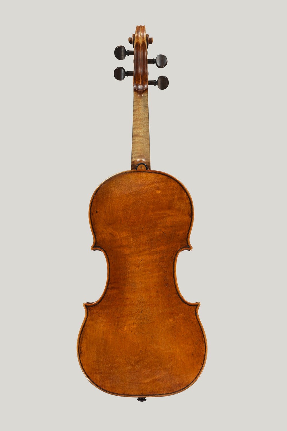 The wood choice is typical of Rugeri, with a fine single piece of subtly figured slab-sawn maple providing the back. The well-flamed ribs are cut more conventionally on the quarter. The front is of the usual fine-grained alpine spruce, quarter-cut and jointed in the centre. The instrument still bears a remarkably well-preserved coating of fine orange-brown varnish, illuminated by a rich gold-tinted ground.