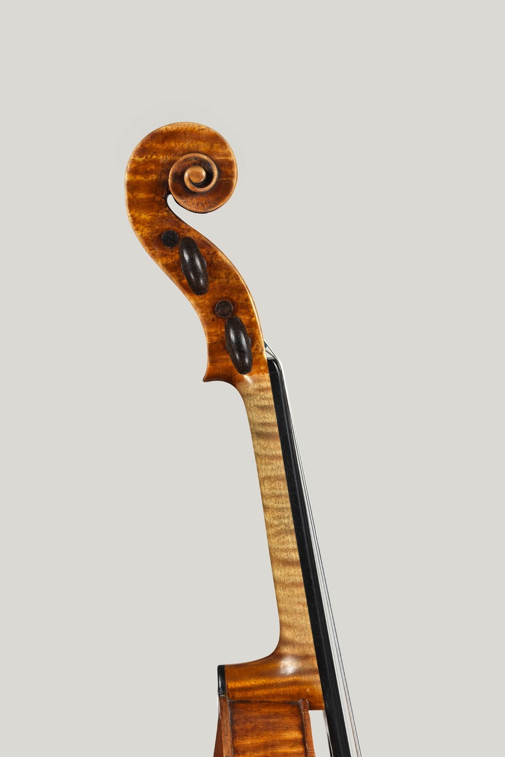 This violin utilises Nicolò Amati’s ‘grand pattern’, a widened version of earlier forms. Rugeri has given it a particularly full arching, with a flattened area along the centre part of the front, and only a light recurve at the edges. Rugeri’s purfling is neatly inlaid, but lacks the extended mitres at the corner joints that are a feature of Amati’s work. Rugeri is unique amongst Cremonese makers in using maple for the white core of the inlay, a small but again significant variation from the Amati style. The scroll is also very representative of Francesco’s work. It possesses a slight ovality in the volute, with a broad first turn which is left flat, the undercutting of the spiral increasing dramatically as it approaches the eye. All the surfaces are finely finished, apparently cut cleanly with edge tools rather than polished with abrasives.