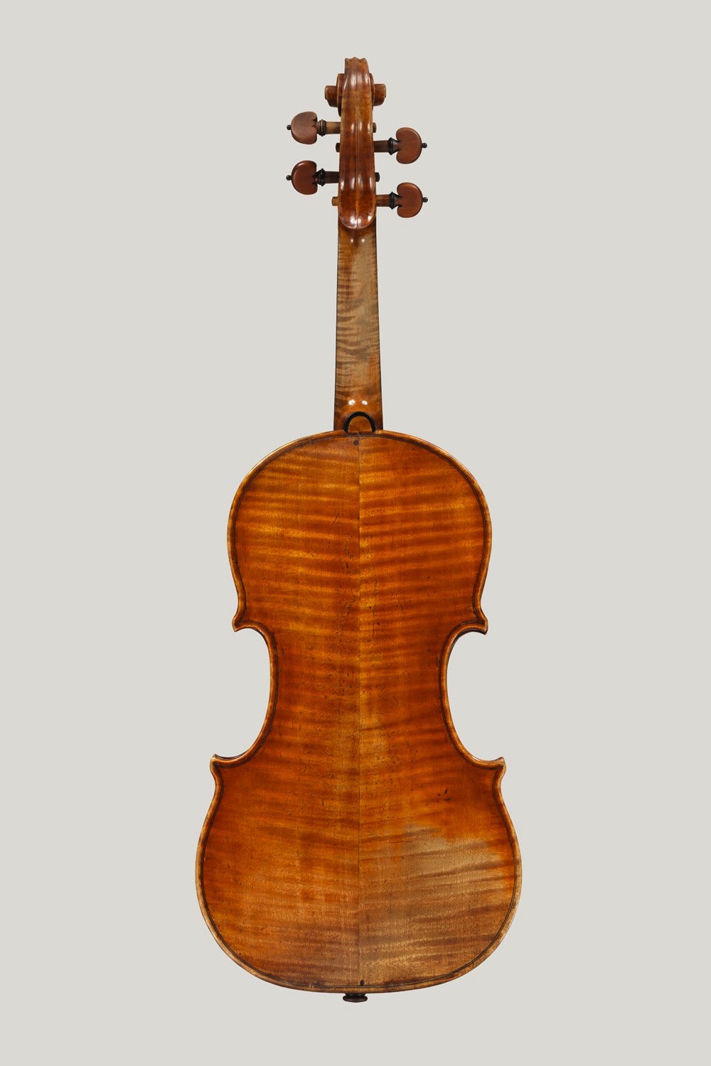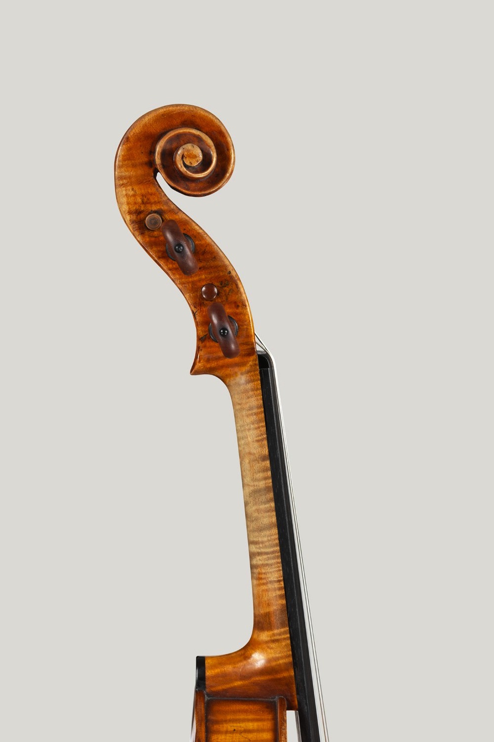 Guadagnini was a true original amongst many inspirational Italian makers of the 18th century, and seems to owe little to any one of them. His apparently self-educated technique does not easily connect to other makers of the time, but he nevertheless achieved results at the very least equal to, and usually superior to those of any of his contemporaries. His outline form is well proportioned in the classical manner, but does not seem to be derived from any other maker in particular. The soundholes, with their oval lobes and long, unfluted wings are also quite original. On the scroll, a series of puncture marks can be seen around the eye, which are undoubtedly relics of the original marking out from the template. These are almost invariably present in Guadagnini’s work, but absent from that of any other maker.