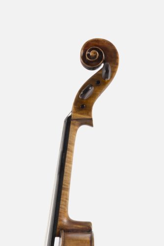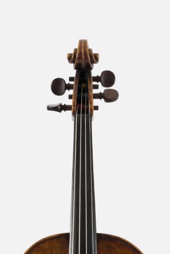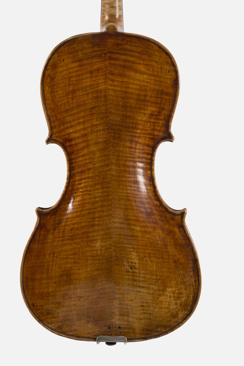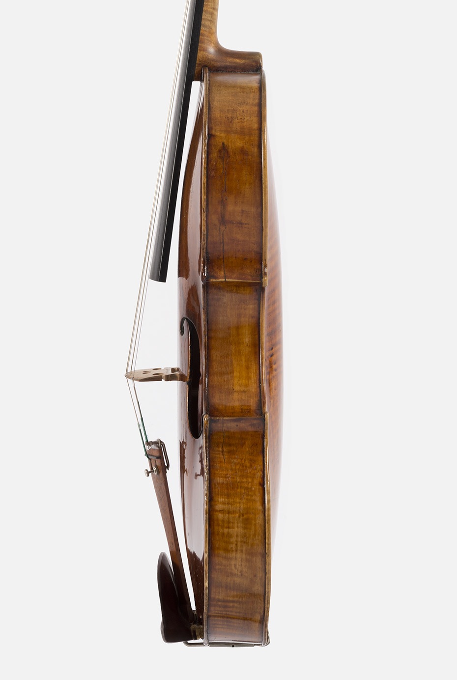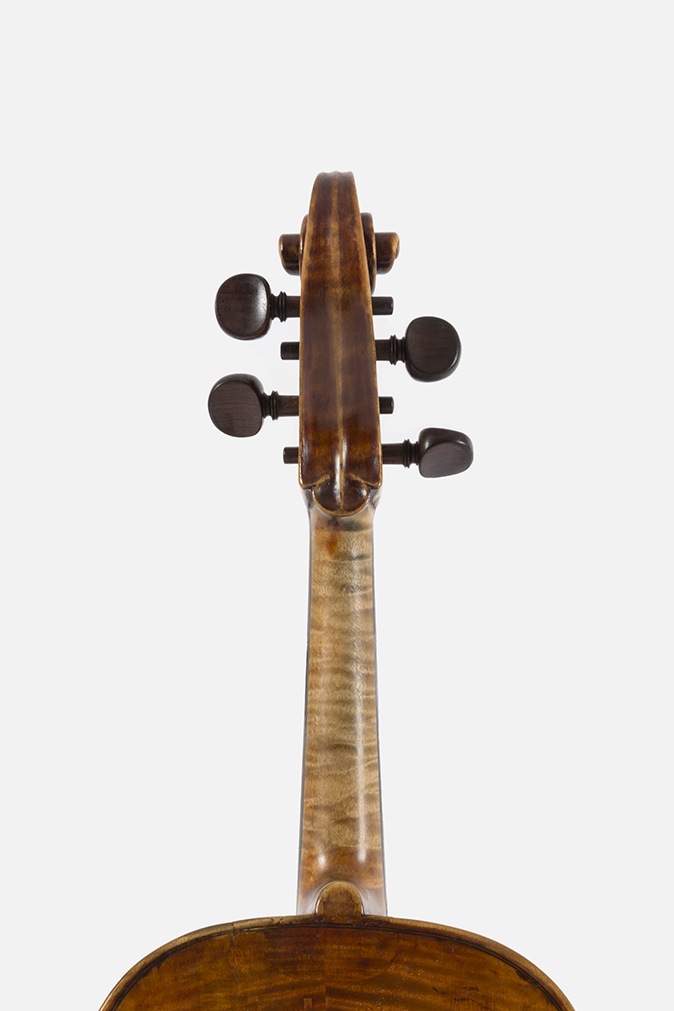 He is particularly valued for his cellos and violas, which unusually seem to outnumber his violins. Cellos were a notable specialisation of Venetian makers. Violas however, were never produced in significant numbers by any classical Italian makers, apart from the Brescians Gaspar da Salo and Giovani Paolo Maggini. Even then, few conformed to a comfortable size for modern orchestral playing, but by Busan’s time, this had begun to settle, and his work, mostly made to modern proportions, is very much in demand. This viola attributed to him is nevertheless quite large in its body, measuring 427mm in length, but its breadth and depth provide the required depth of viola tone. The almost brutal, squared-off form of the body looks as if it has been cut and carelessly altered, like so many earlier tenor instruments, but it is original.