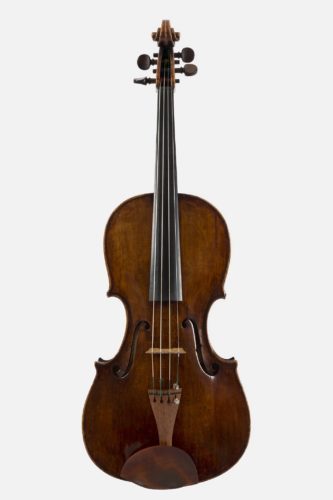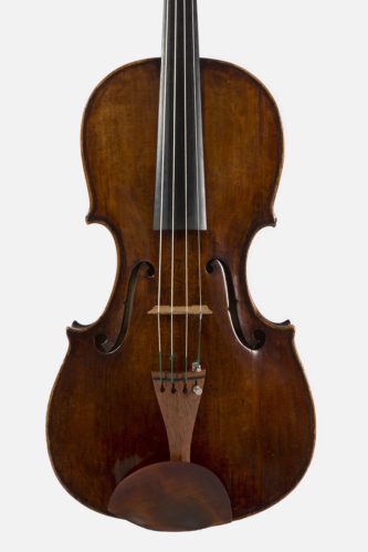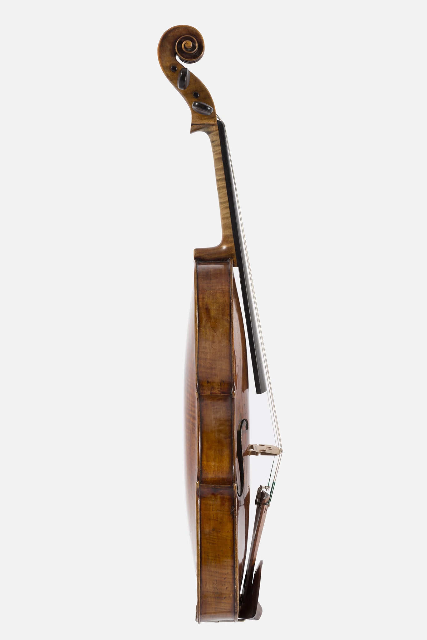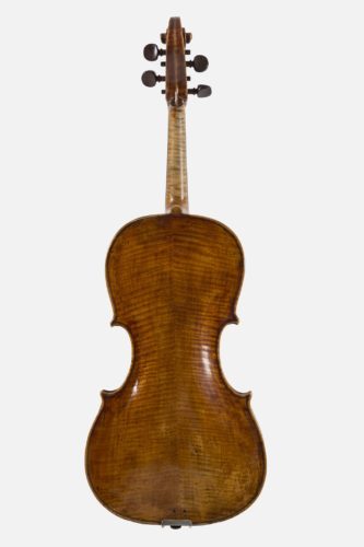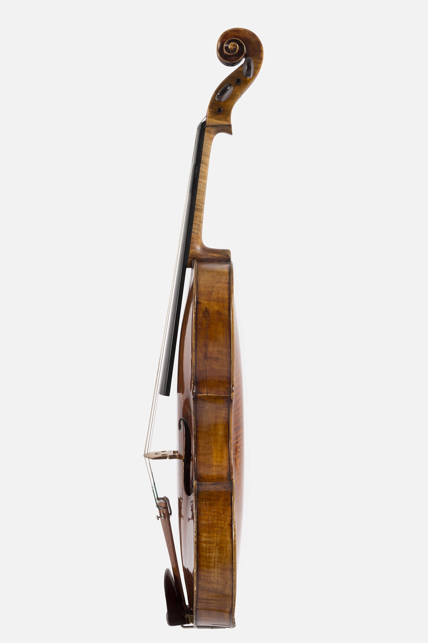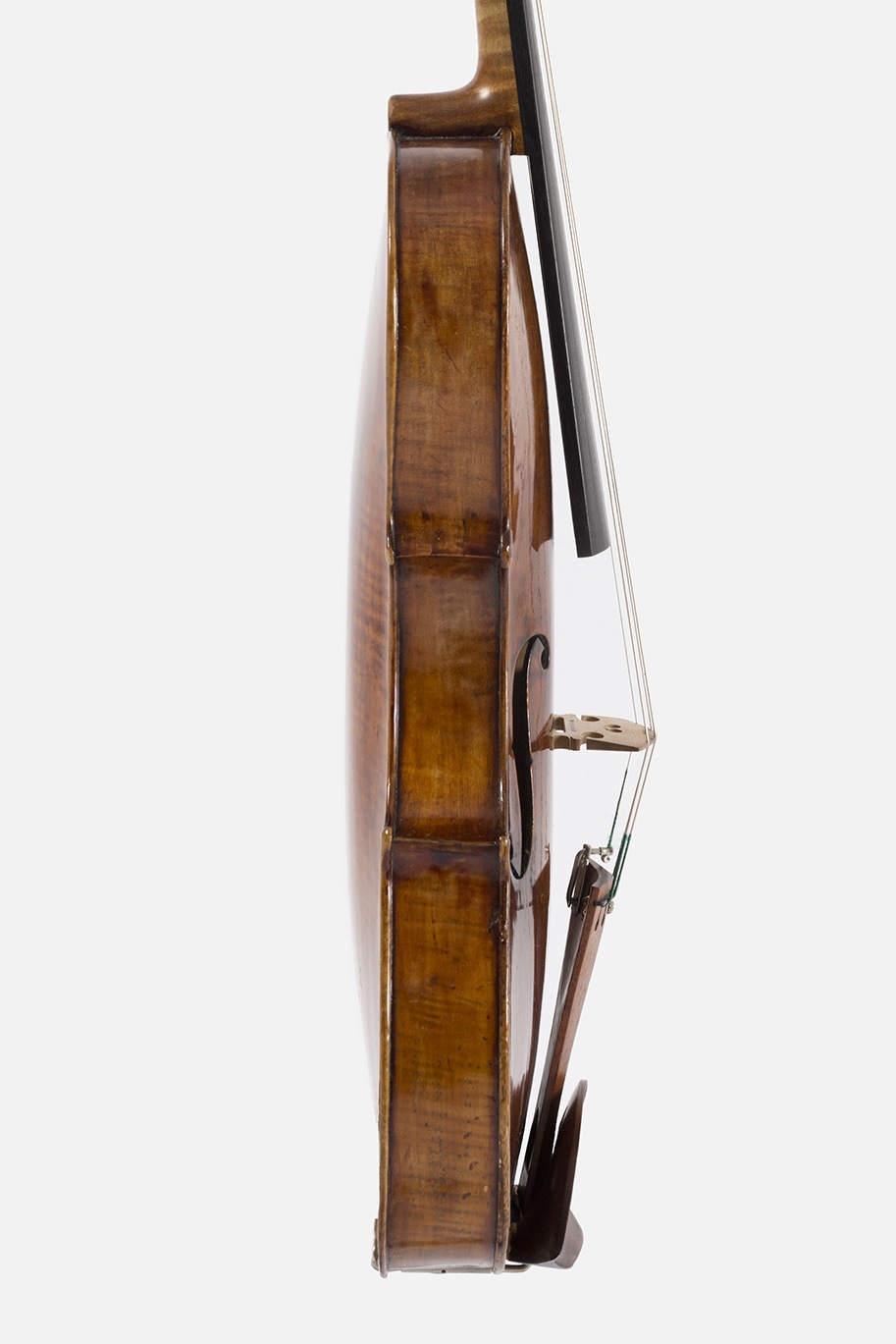 He is particularly valued for his cellos and violas, which unusually seem to outnumber his violins. Cellos were a notable specialisation of Venetian makers. Violas however, were never produced in significant numbers by any classical Italian makers, apart from the Brescians Gaspar da Salo and Giovani Paolo Maggini. Even then, few conformed to a comfortable size for modern orchestral playing, but by Busan’s time, this had begun to settle, and his work, mostly made to modern proportions, is very much in demand. This viola attributed to him is nevertheless quite large in its body, measuring 427mm in length, but its breadth and depth provide the required depth of viola tone. The almost brutal, squared-off form of the body looks as if it has been cut and carelessly altered, like so many earlier tenor instruments, but it is original.