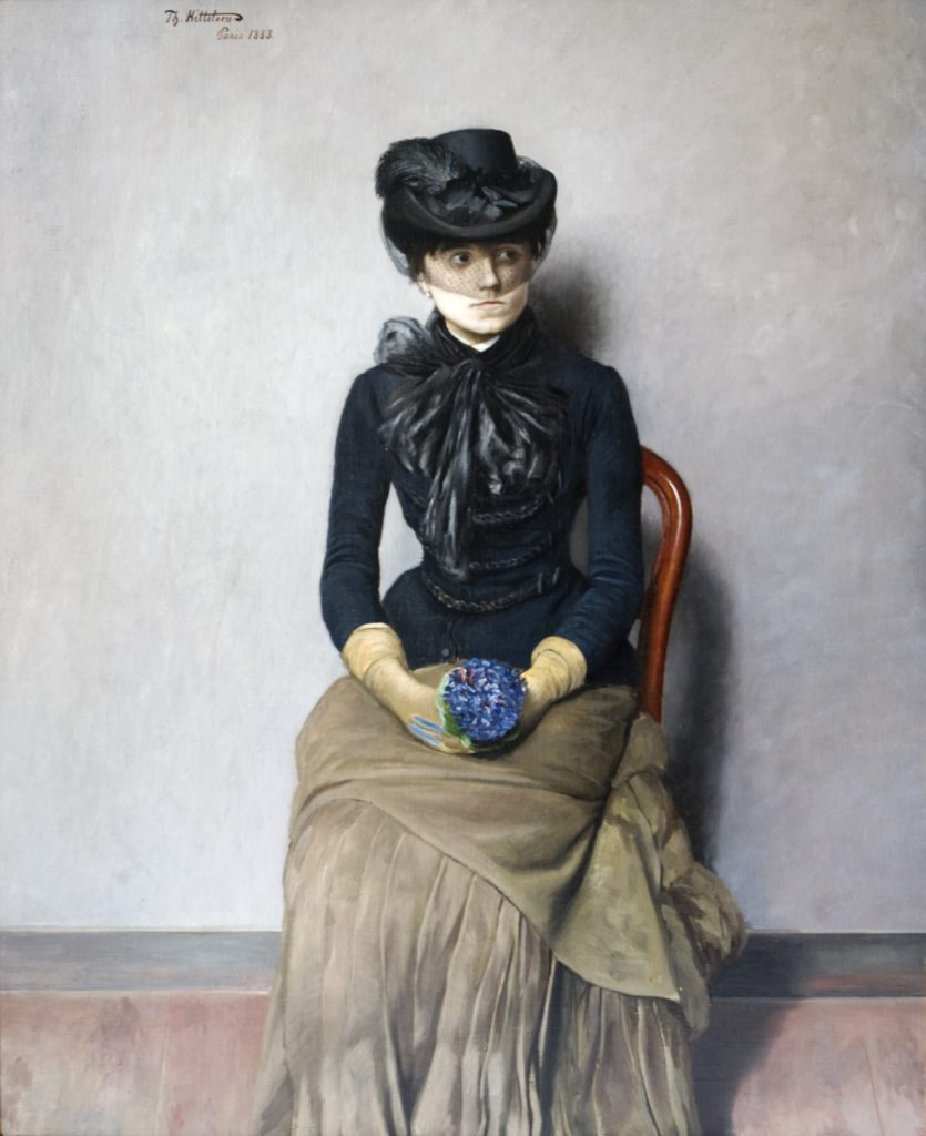 I litteraturen om Kittelsen har dette maleriet av og til fått den mer nøytrale tittelen Studie, men går vi tilbake til den store Kittelsen-utstillingen i Kristiania Kunstforening i 1911, da kunstneren fremdeles var i live, var tittelen I venteværelset. Vi vet ikke hva slags ”venteværelse” dette var – ventet hun på toget … på en bekjent … eller kanskje på politilegen? Sett på bakgrunn av bildets tittel og kunstnerens tidlig uttalte sosiale engasjement, er den unge kvinnen kanskje en kokotte (de var mye brukt som modeller i Paris på denne tiden), og maleriet kan muligens oppfattes som en kommentar til de prostituertes situasjon i samfunnet. I så fall peker I venteværelset frem mot Christian Krohgs sosialt engasjerte Albertine-bilder fra noe senere på 1880-tallet.