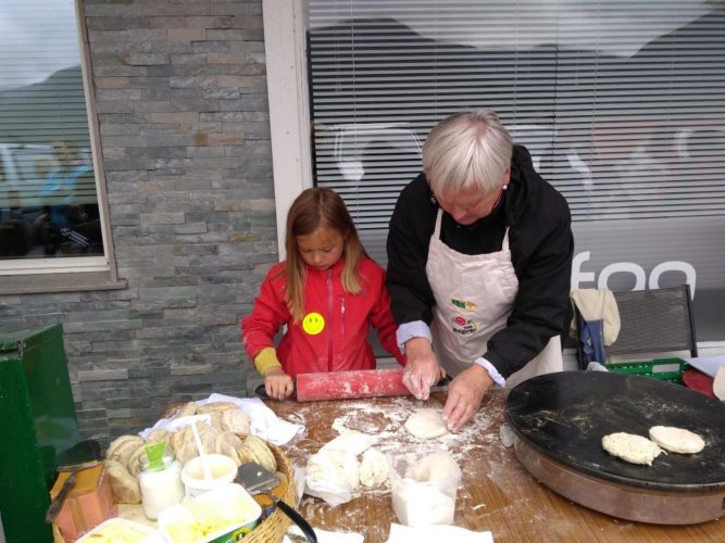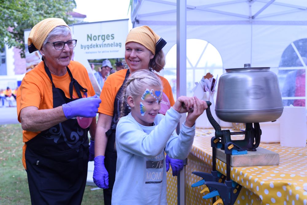 Tre generasjoner i sving med smørkinna da Bjørgum Bygdekvinnelag deltok på Verdens Kuleste Dag 2019. (foto: Helle Berger)