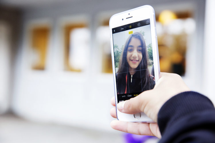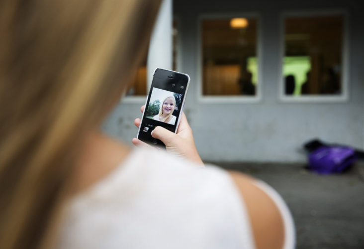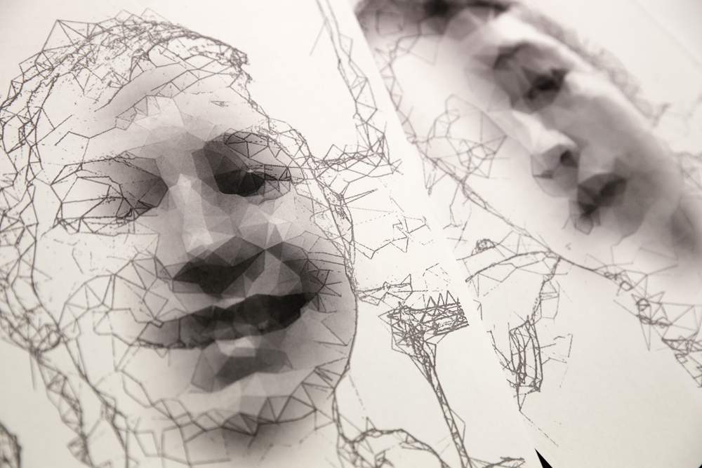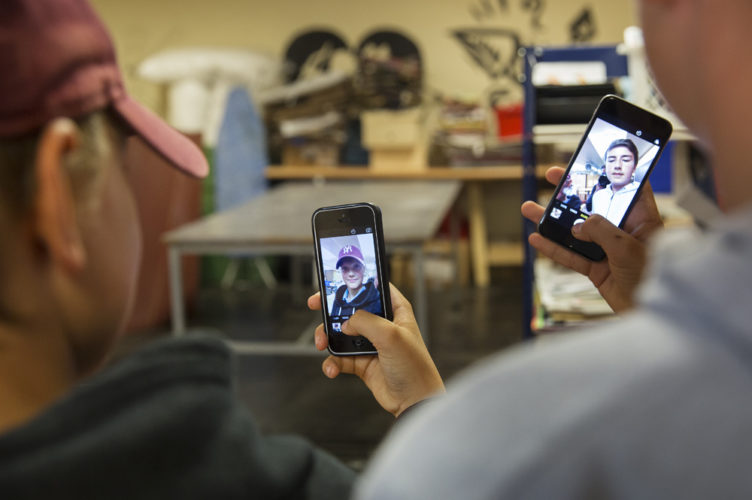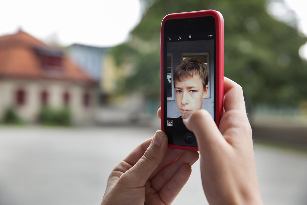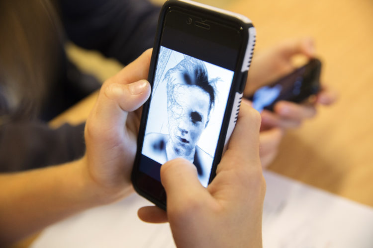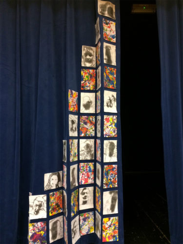 Elevenes bearbeidede selvportretter ble applikasjone på det nye sceneteppet. (Foto: Sverre Chr. Jarild)