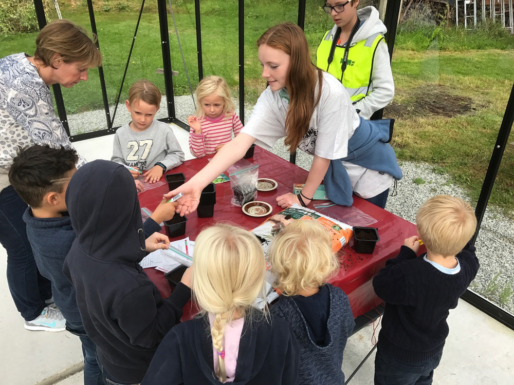 4H medlem underviser barn i hvordan lage sitt eget lille mini-drivhus inne i det nye drivhuset. (Foto: Astrid Lindstad)