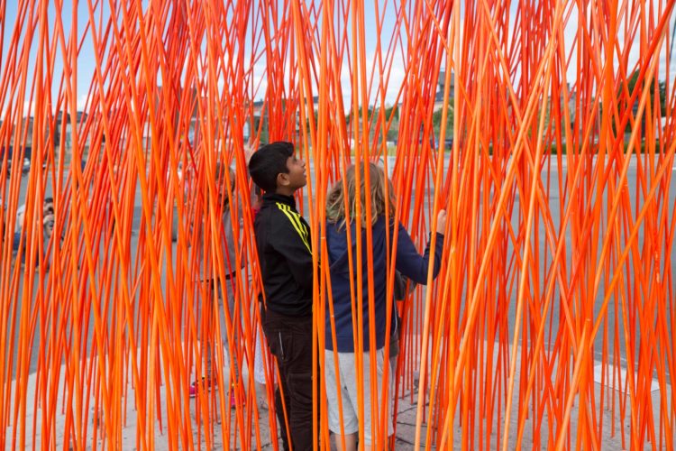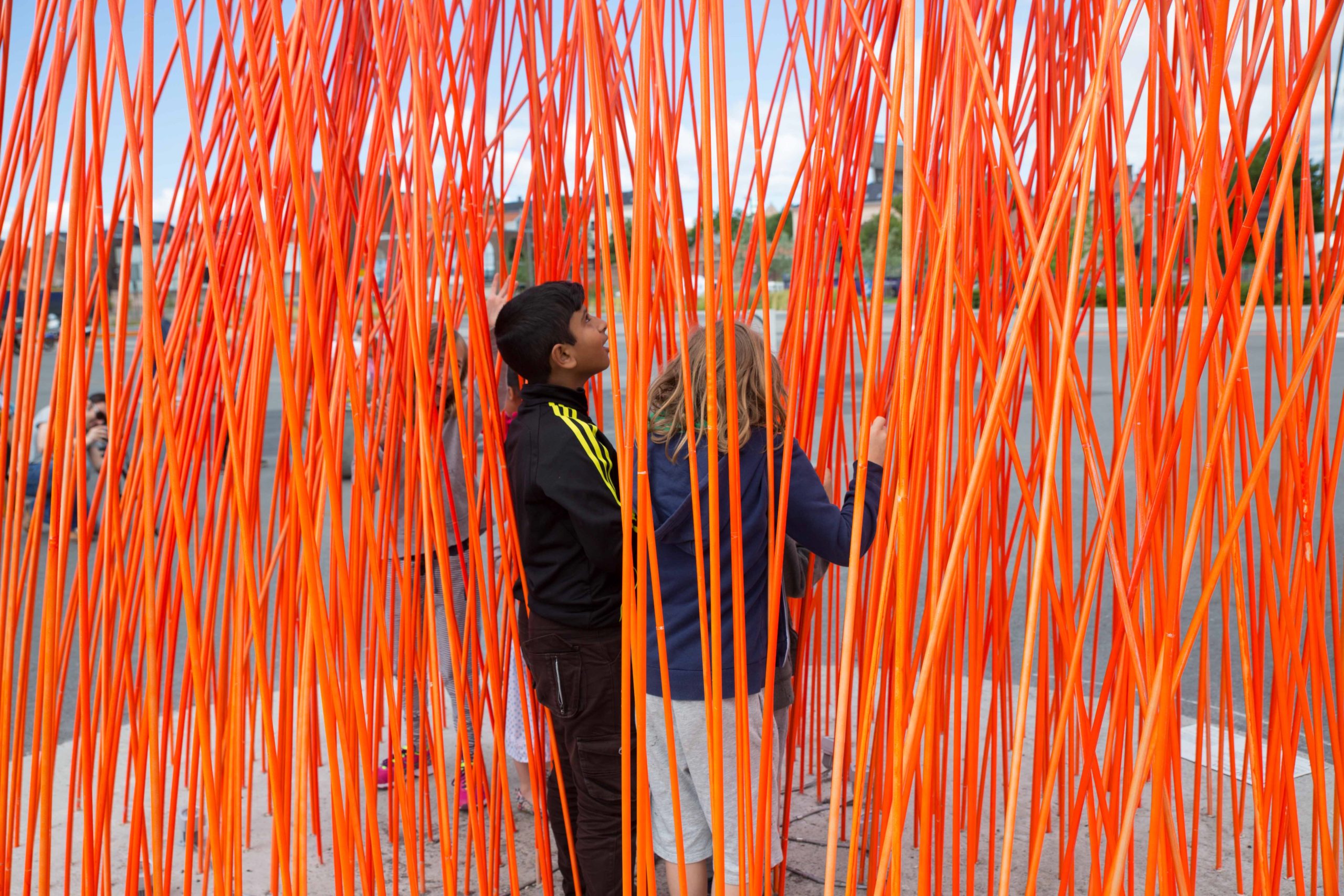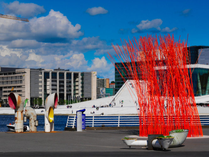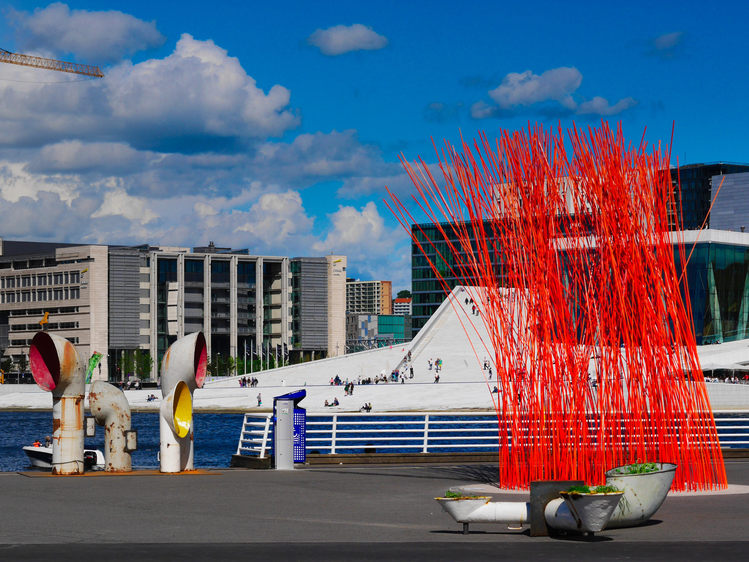 Denne neonrøde skulpturen kan du se langs Havnepromenaden i Oslo. (Foto: Christian Bermudez)
