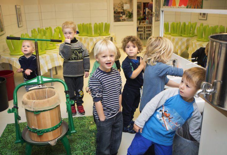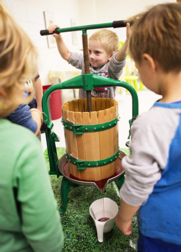 Barna i Jareteigen Montessori-barnehage i full gang med å presse saft fra druer og epler som de har fått med fra foreldrenes hager. (Foto: Sverre Chr. Jarild)