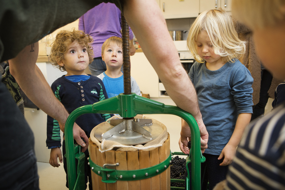Barna i Jareteigen Montessori-barnehage i full gang med å presse saft fra druer og epler som de har fått med fra foreldrenes hager. (Foto: Sverre Chr. Jarild)