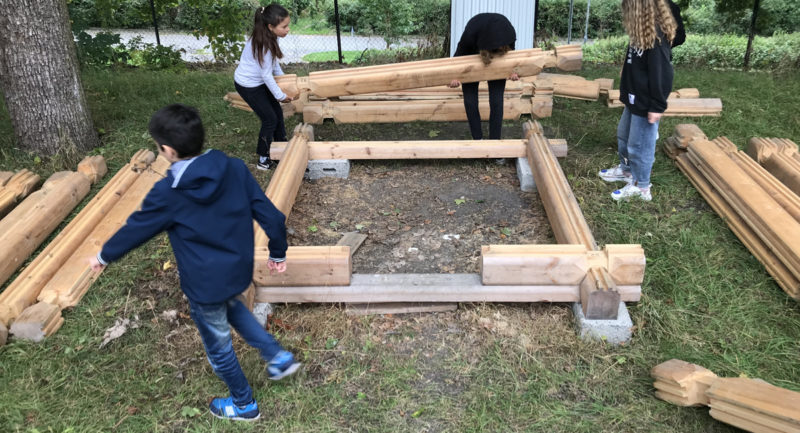 “Håndverkskurs for barn” er en dag på Vøienvolden gård der skoleelever får lære om tradisjonelle håndverksteknikker og hvordan man bygger et hus.
