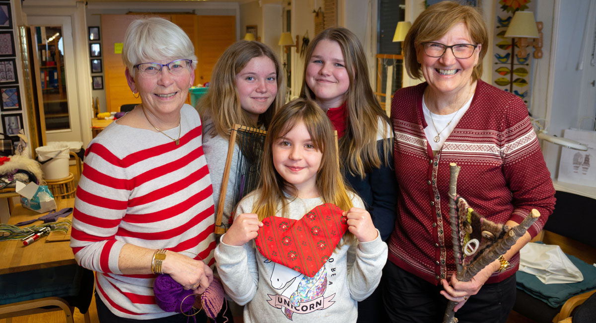 Jentene som er med på håndverkskursene til Tønsberg Husflidslag er veldig fornøyd. Fra venstre: Ingjerd Knoph Andreassen, Olivia Førendal Haugan, Aurora Mystad Olsen, Tove E. Forså. Foran er Frøya Kristine Øyseth. (Alle foto: Adrian Møller Haugan)