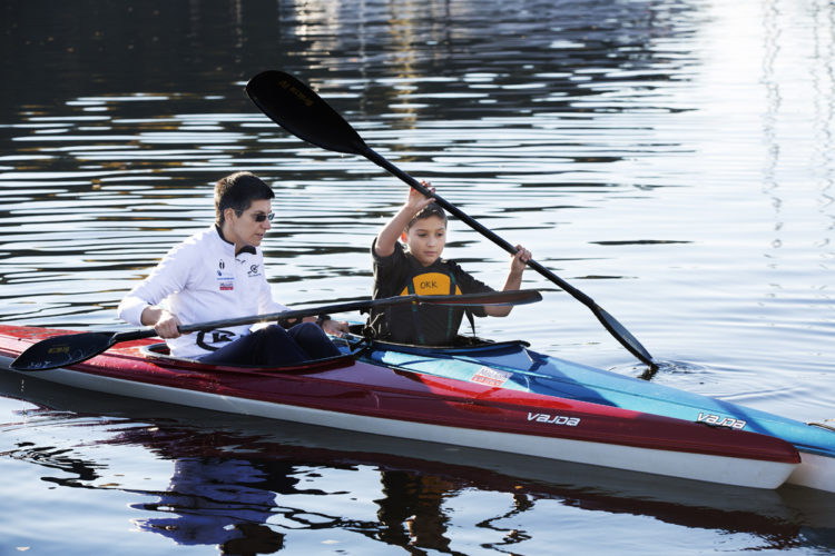 10 år gamle Aleksa prøver kajakk for første gang. Han får gode råd av den tidligere serbiske landslagspadleren Nevena Vlasic. (Foto: Sverre Chr. Jarild).