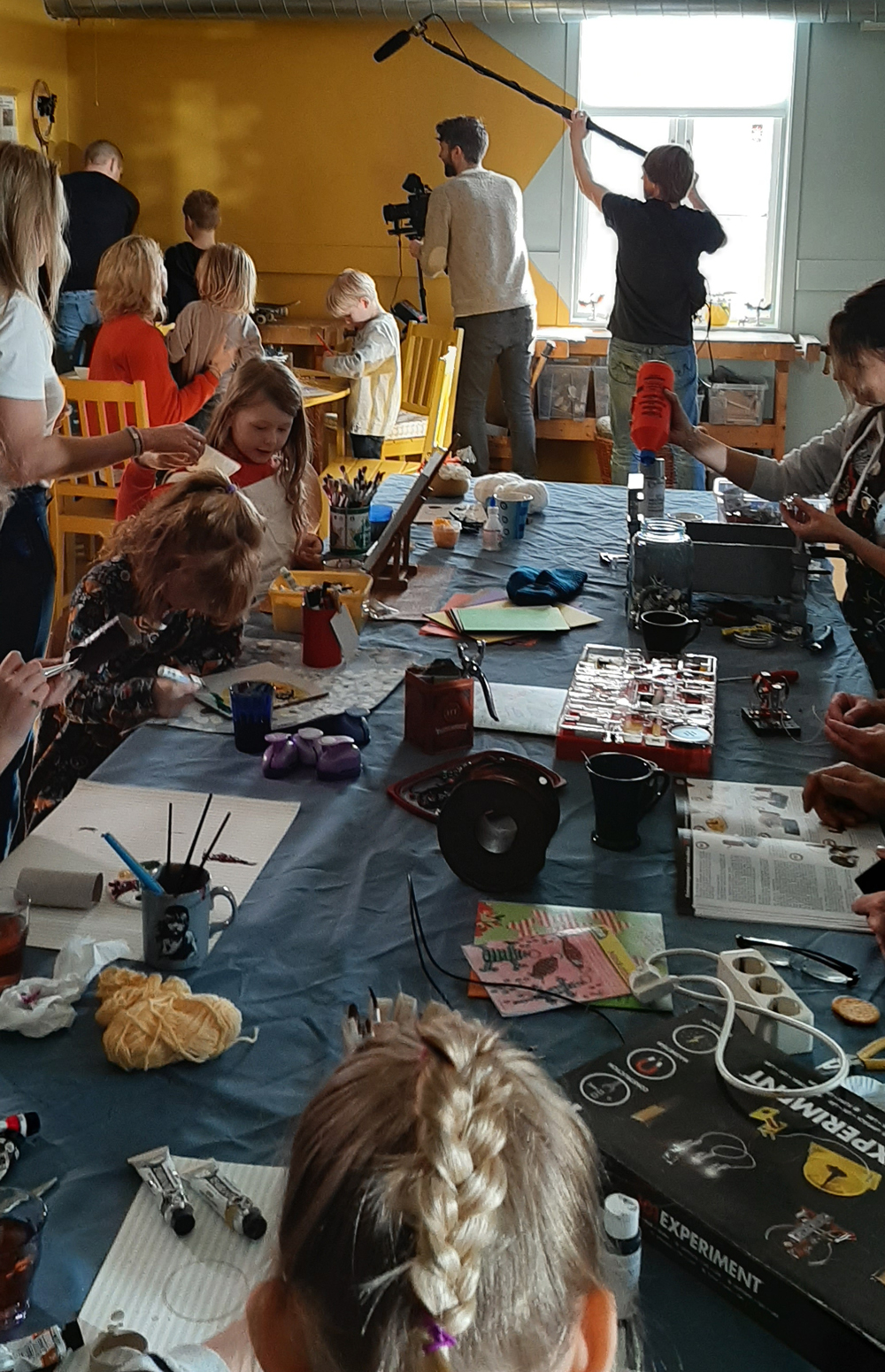 Barn, unge og eldre inspireres til å skape på nye måter. Det arrangeres kurs for familier, grupper, barnehager og skoler.