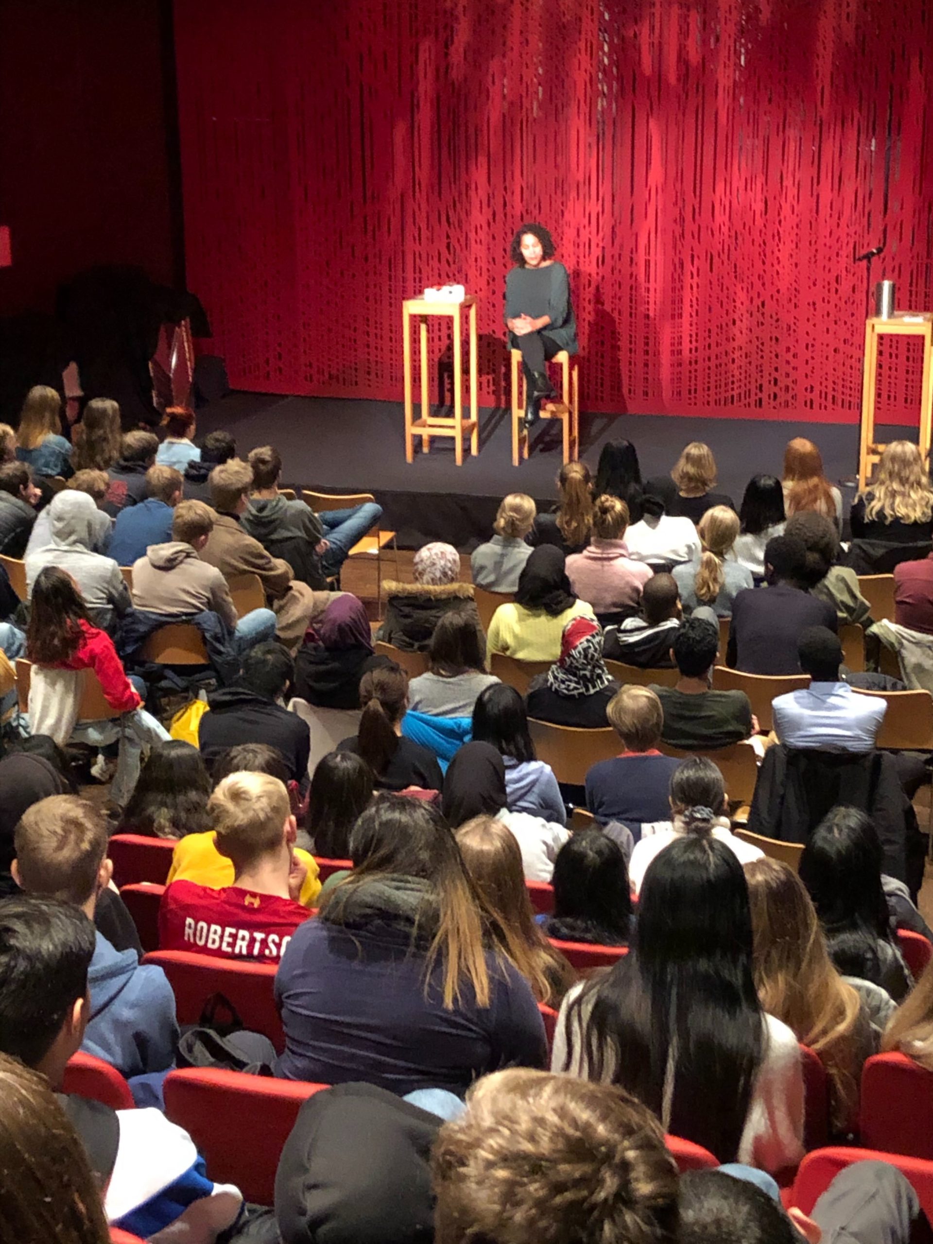 Forfatter, scenekunstner og dramatiker Camara Lundestad Joof møtte 1500 elever fra 27 ulike videregående skoler på Litteraturhuset høsten 2019. (Alle foto: Litteraturhuset).