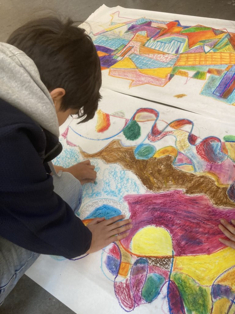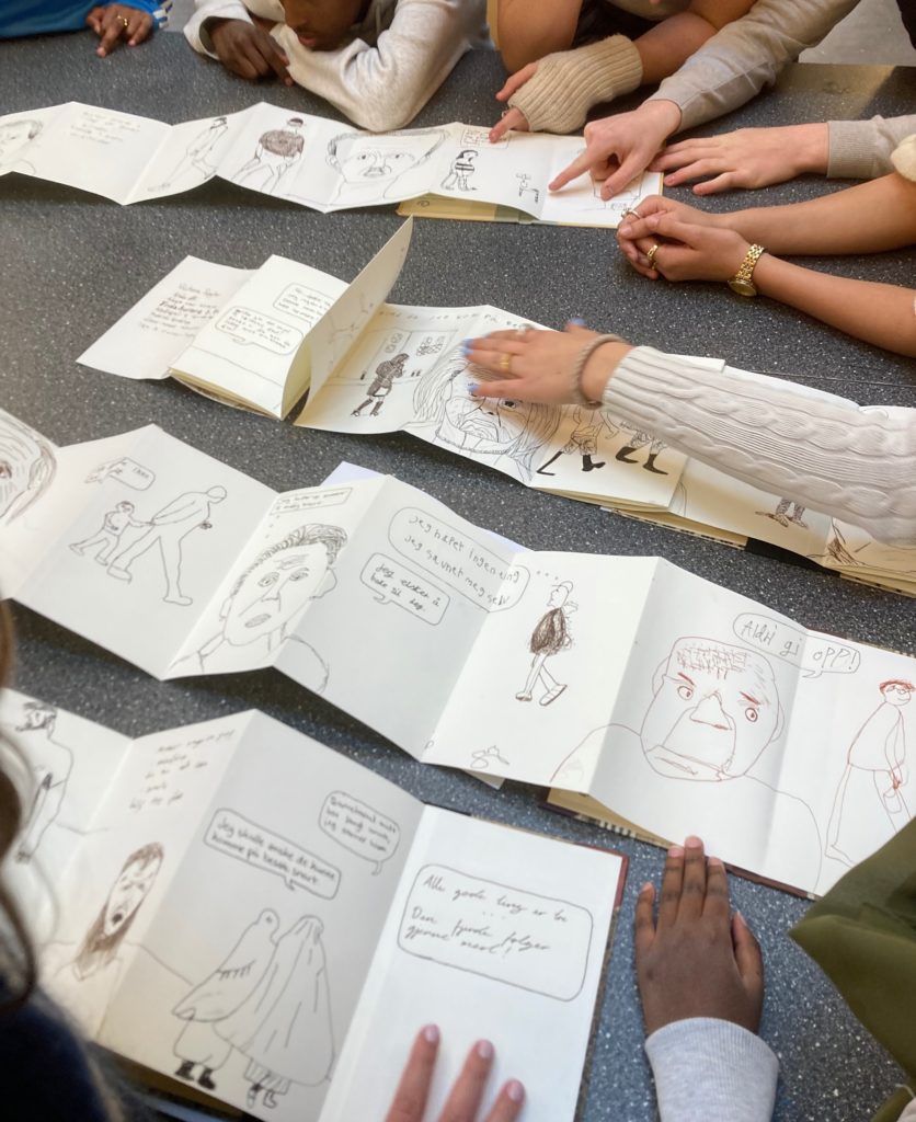 Elevene deltok i felles tegneøvelser og utforsket tegning som språk og uttrykksform, både individuelt og i grupper. Prosessen startet med abstrakte øvelser og fortsatte med tegning av personlige historier og minner, samt observasjonstegning i nærområdet.